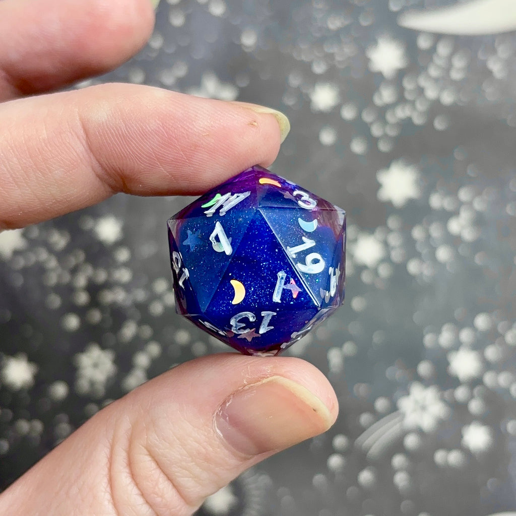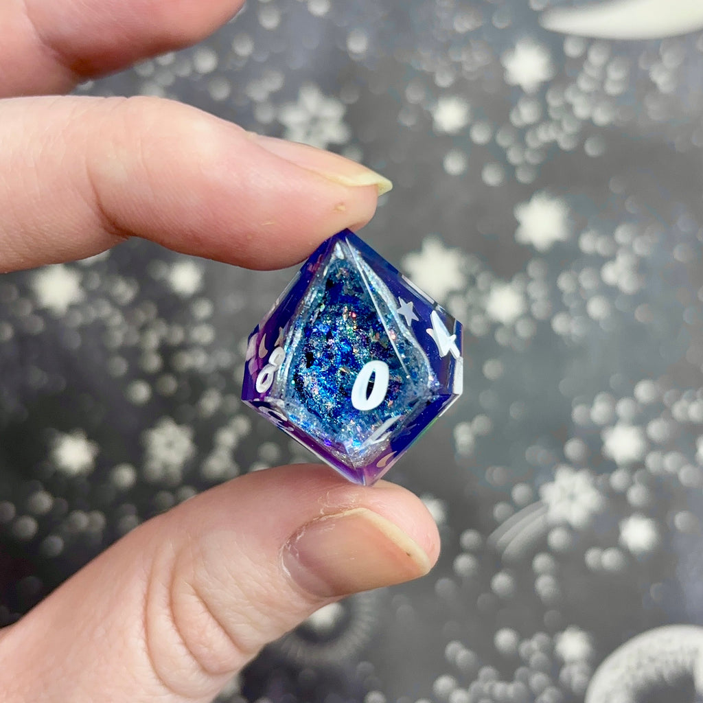 A glittering blue to purple semi-opaque base decorated with silver star and moon glitter is ringed with silver and opens to a cavity filled with iridescent blue glitter and flakes. Numbers inked in translucent white.