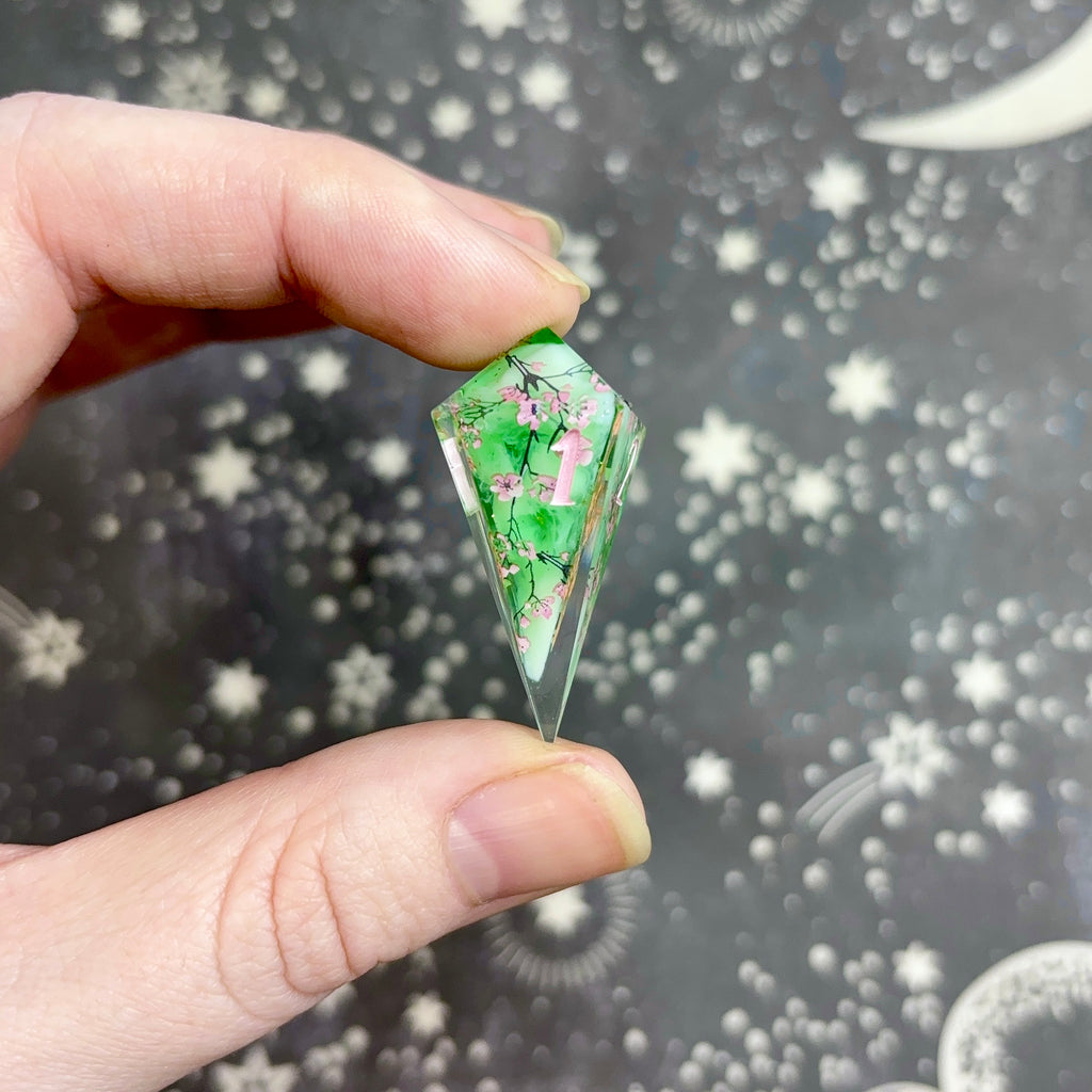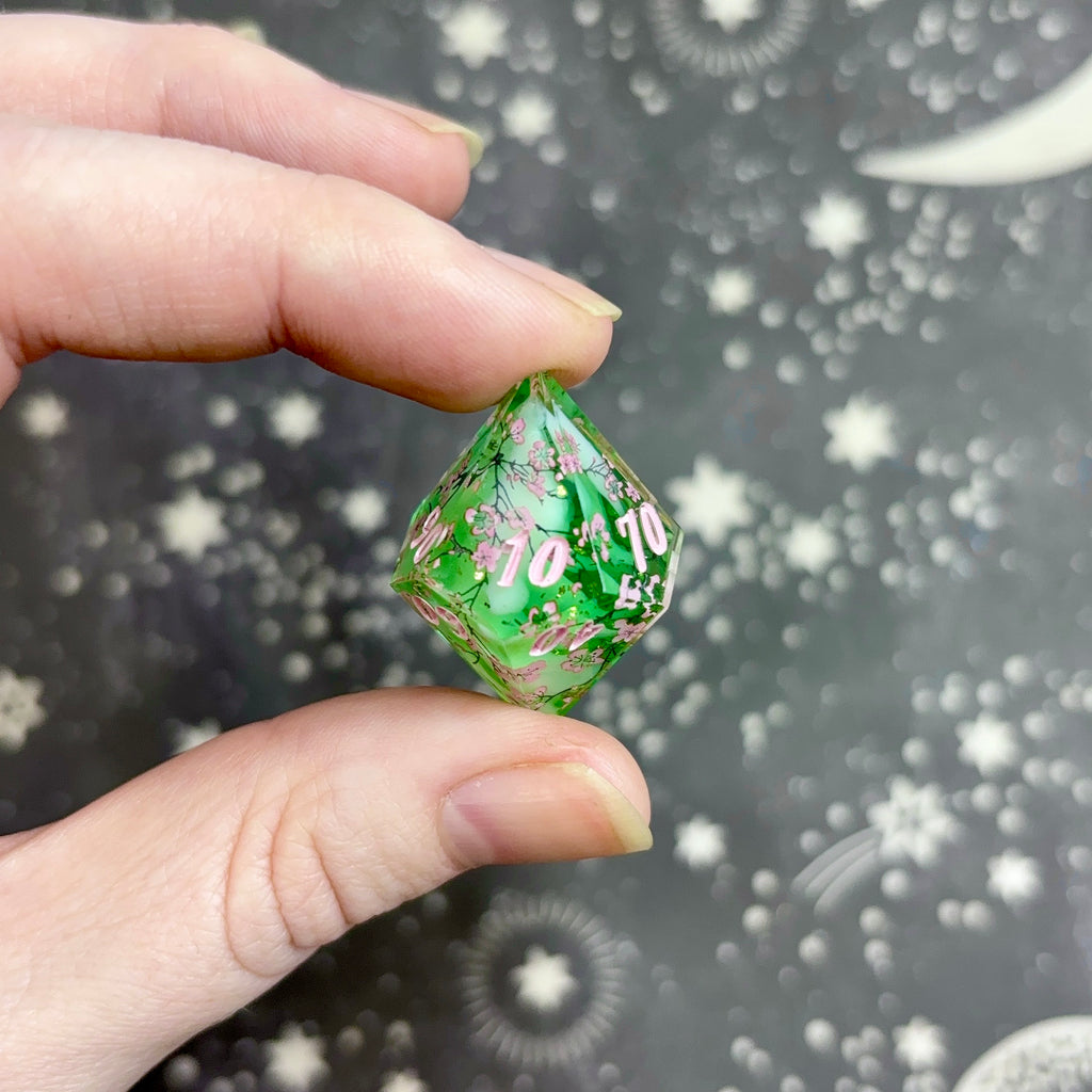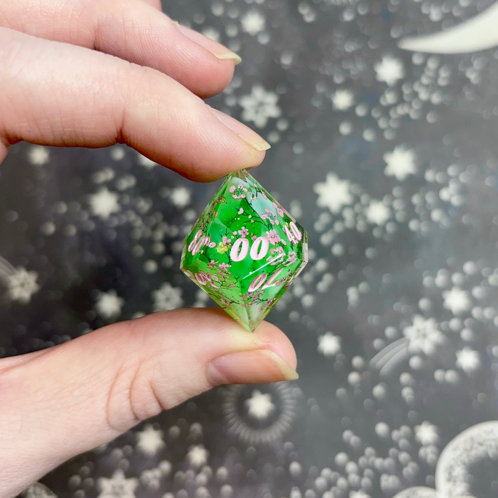 A translucent green base holds gold flakes and opaque white clouds decorated with cherry blossom decals. Numbers inked in light pink.