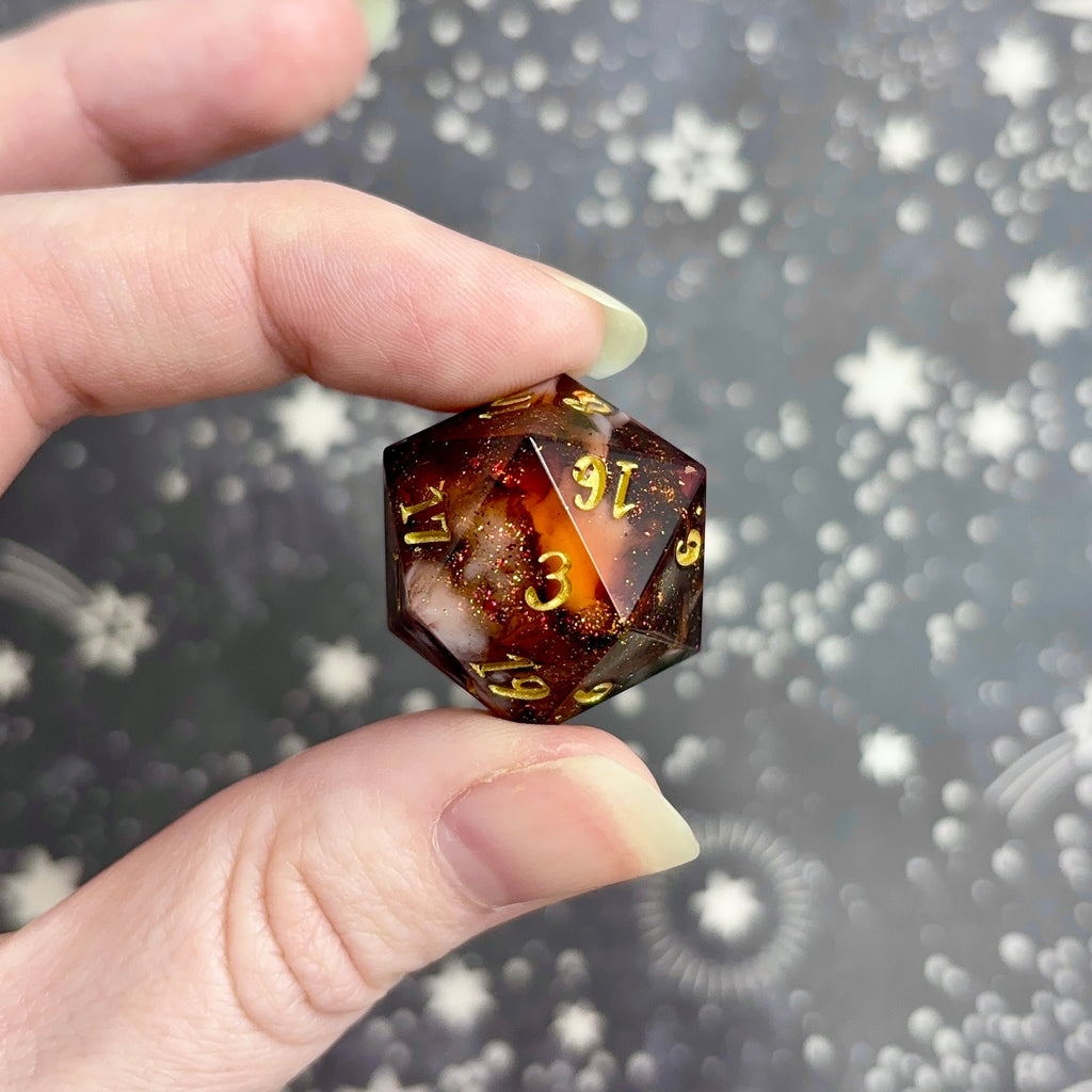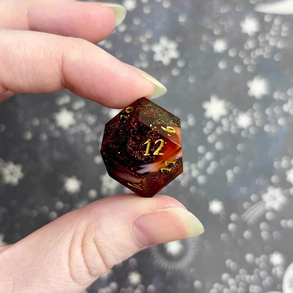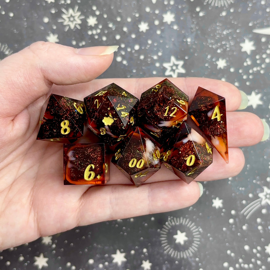 A show-off set (larger dice with smaller numbers on the bottom right) featuring a translucent red base with a splash of intense red, gold, and black glitter and opaque white clouds. Numbers inked in gold.