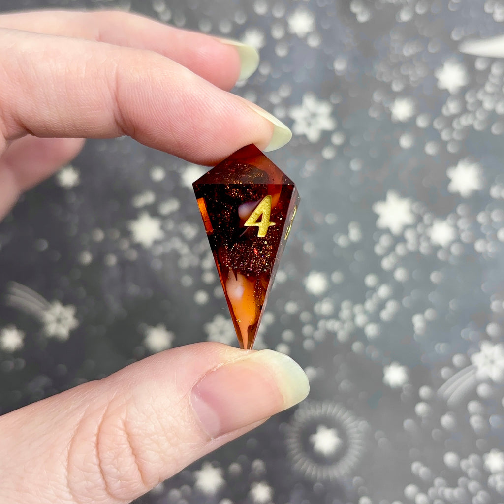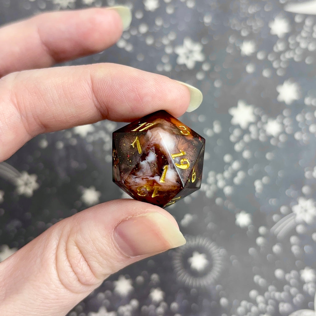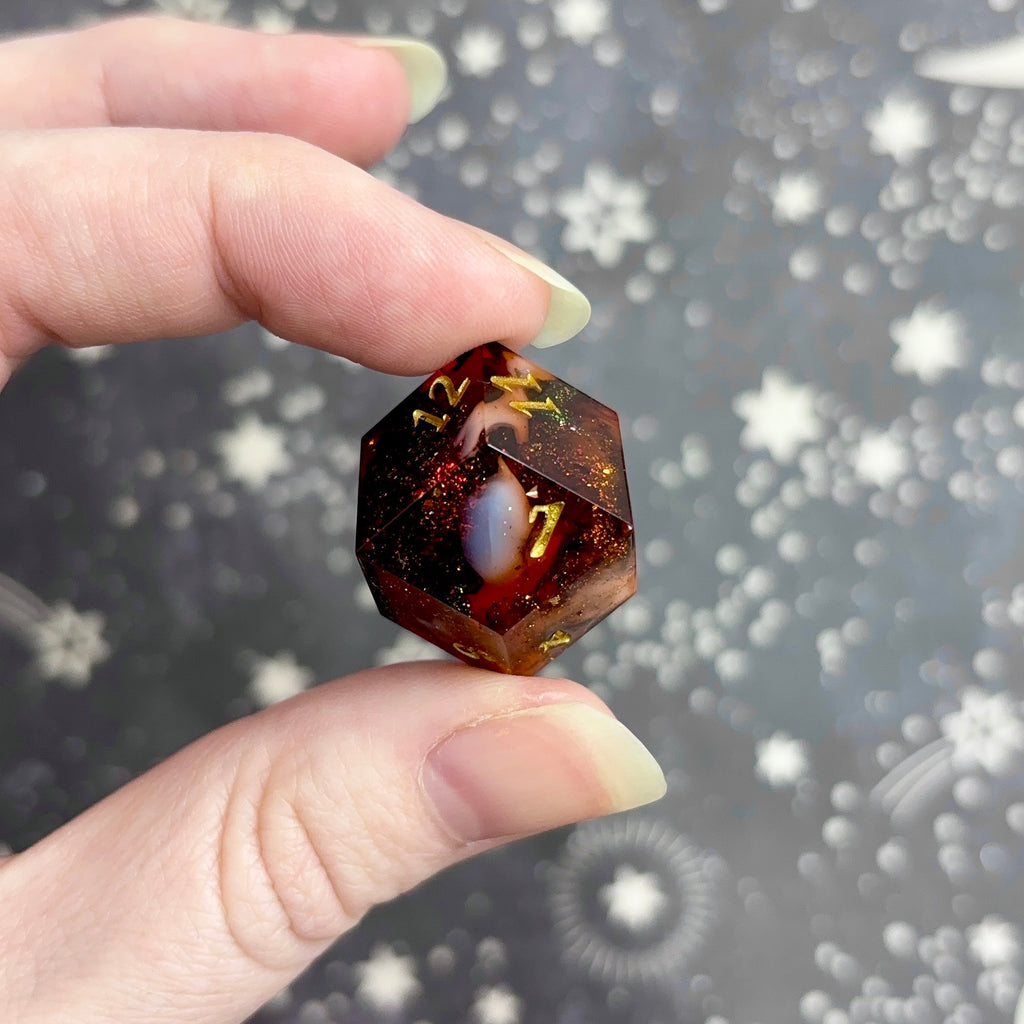 A show-off set (larger dice with smaller numbers on the bottom right) featuring a translucent red base with a splash of intense red, gold, and black glitter and opaque white clouds. Numbers inked in gold.