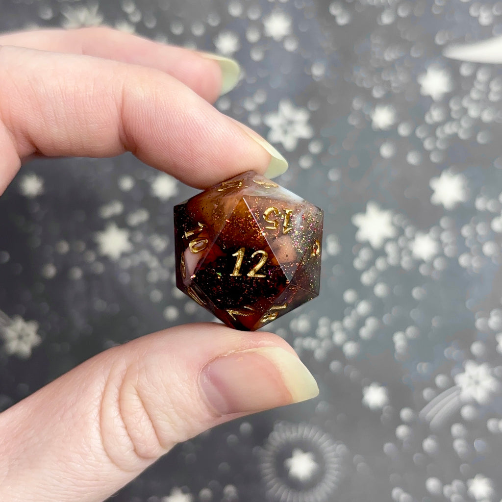 A show-off d20 (larger dice with smaller numbers on the bottom right) featuring a translucent red base with a splash of intense red, gold, and black glitter and opaque white clouds. Numbers inked in brass.