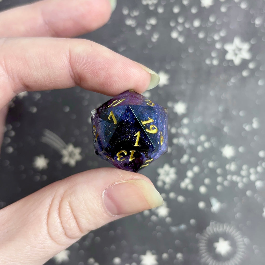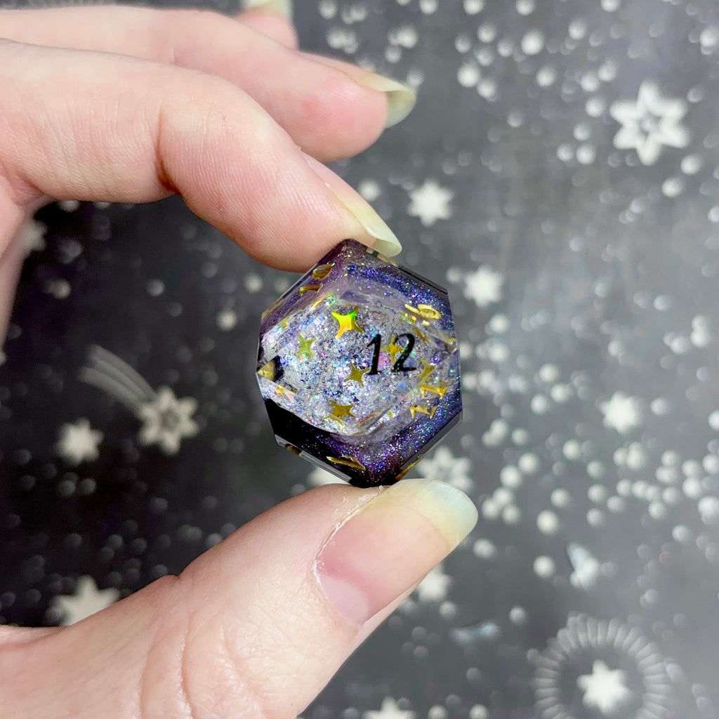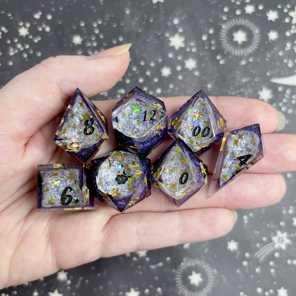 A show-off set (larger dice with the numbers positioned to the bottom right) featuring a translucent, vibrantly glittering purple base with drips of black that opens to a cavity holding an array of glitter and flakes with holographic gold stars resting on top. Numbers inked in gold with glittering black for the high faces.