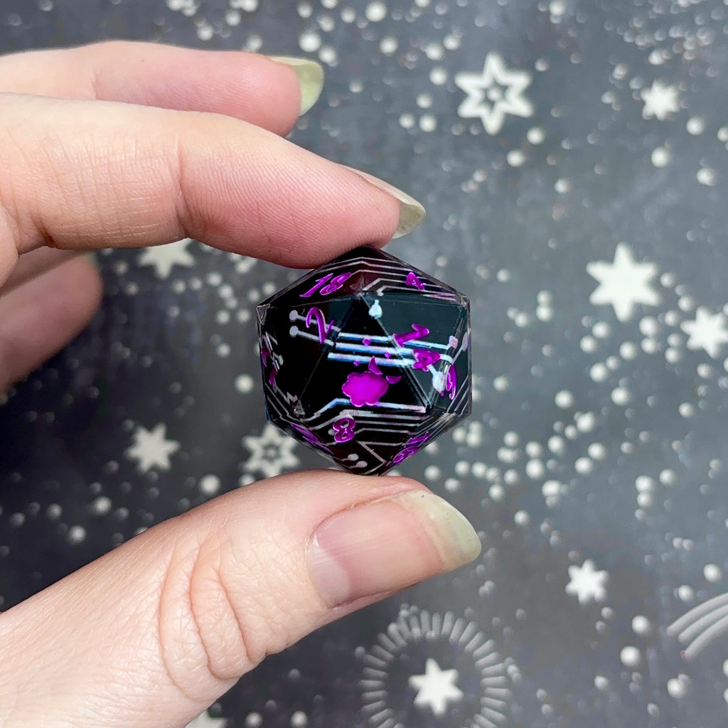 A show-off d20 (larger dice with the numbers positioned to the bottom right) featuring a semi-translucent black base with subtle glitter decorated with silver/pink holographic circuit lines. Numbers inked in neon purple (glow under blacklight).