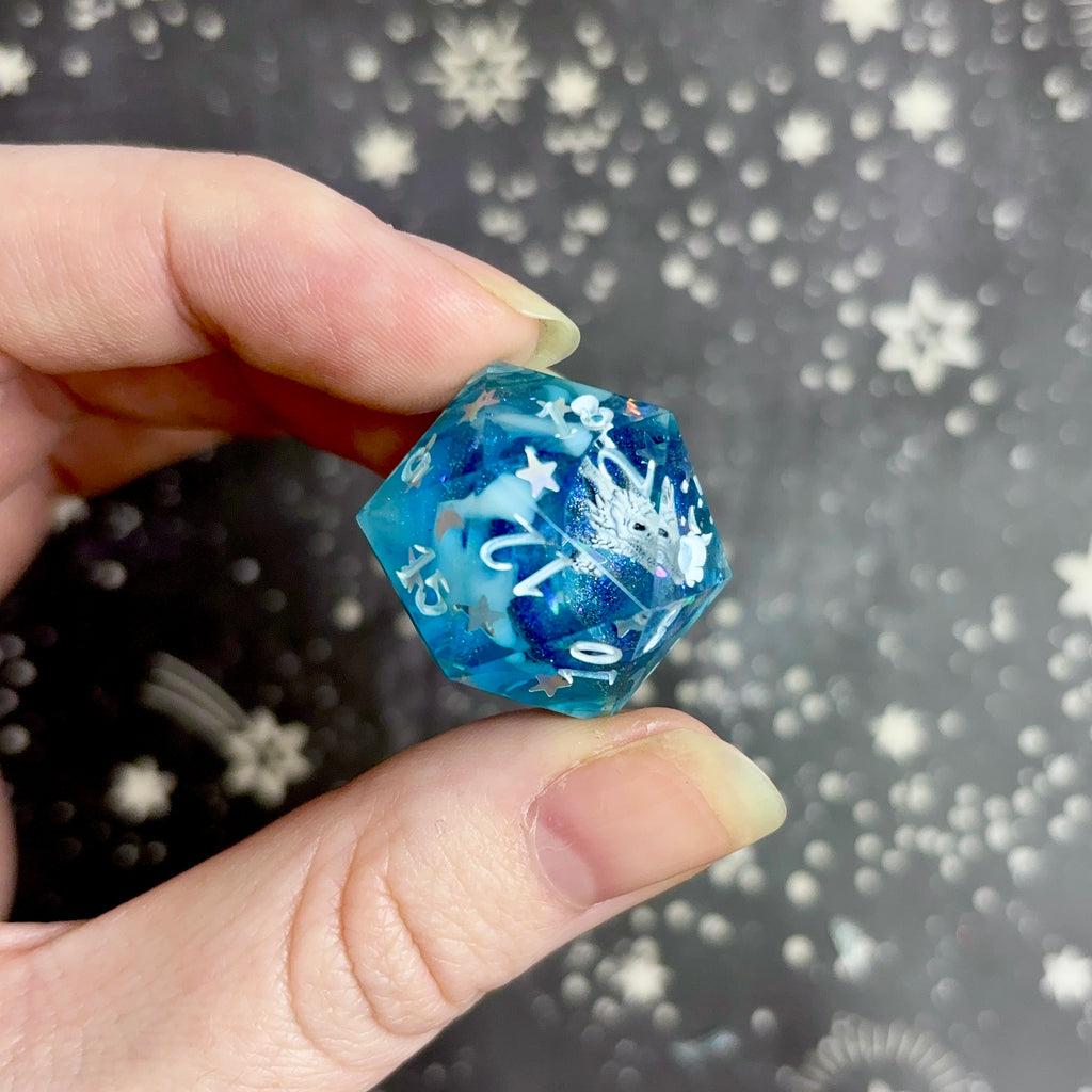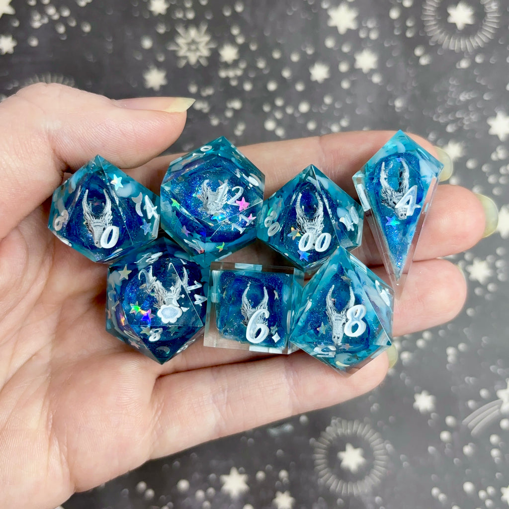 A show-off set (larger dice with the numbers positioned to the bottom right) featuring a translucent blue base filled with dark blue glitter and silver star and moon glitter leading to a cavity holding a white 3d dragon skull in every die. Numbers inked in a translucent white.