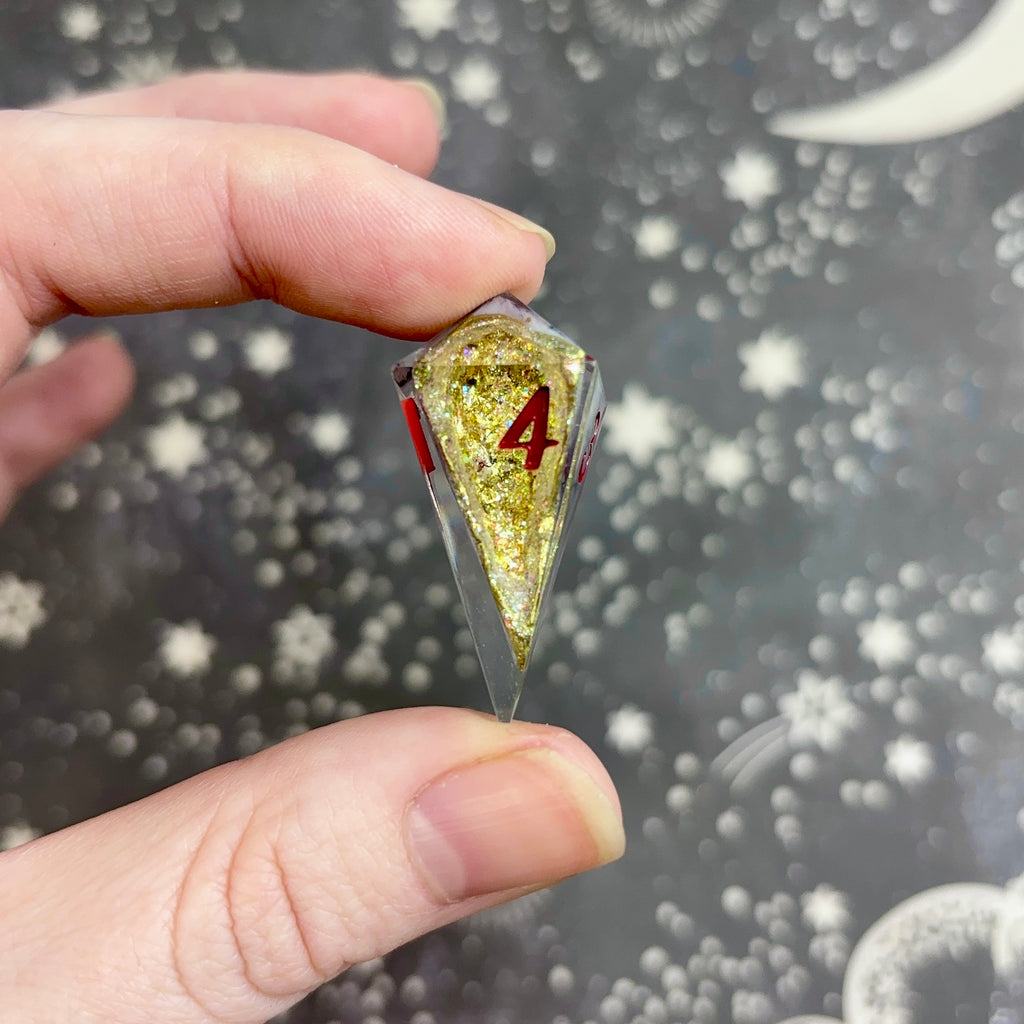 A grey marbled base with flakes of gold and strands of red is ringed with gold and opens to a cavity filled with holographic, glittering gold flakes. Numbers inked in red.