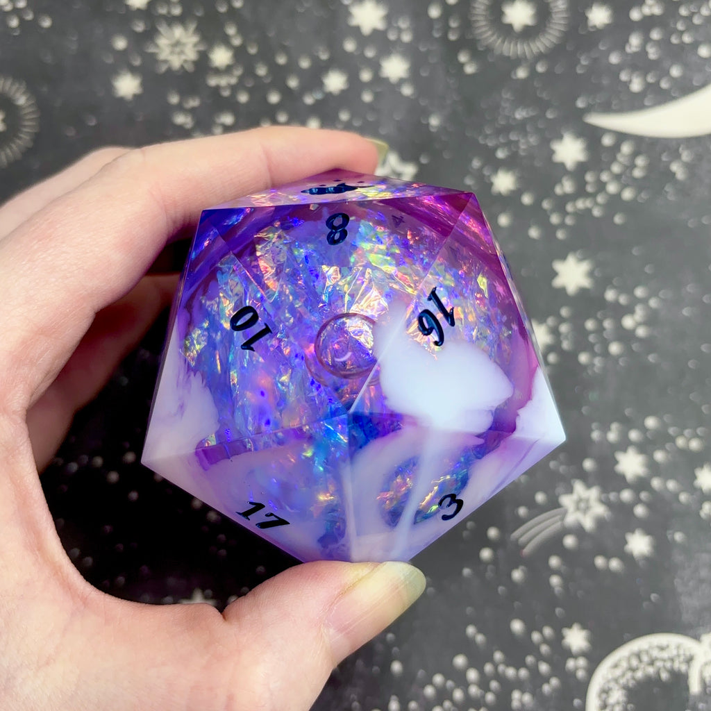 A 60mm liquid core d20 featuring a translucent purple, pink, and blue base holding a swirling mix of blue and iridescent mylar surrounded by opaque white clouds. Numbers inked in navy.