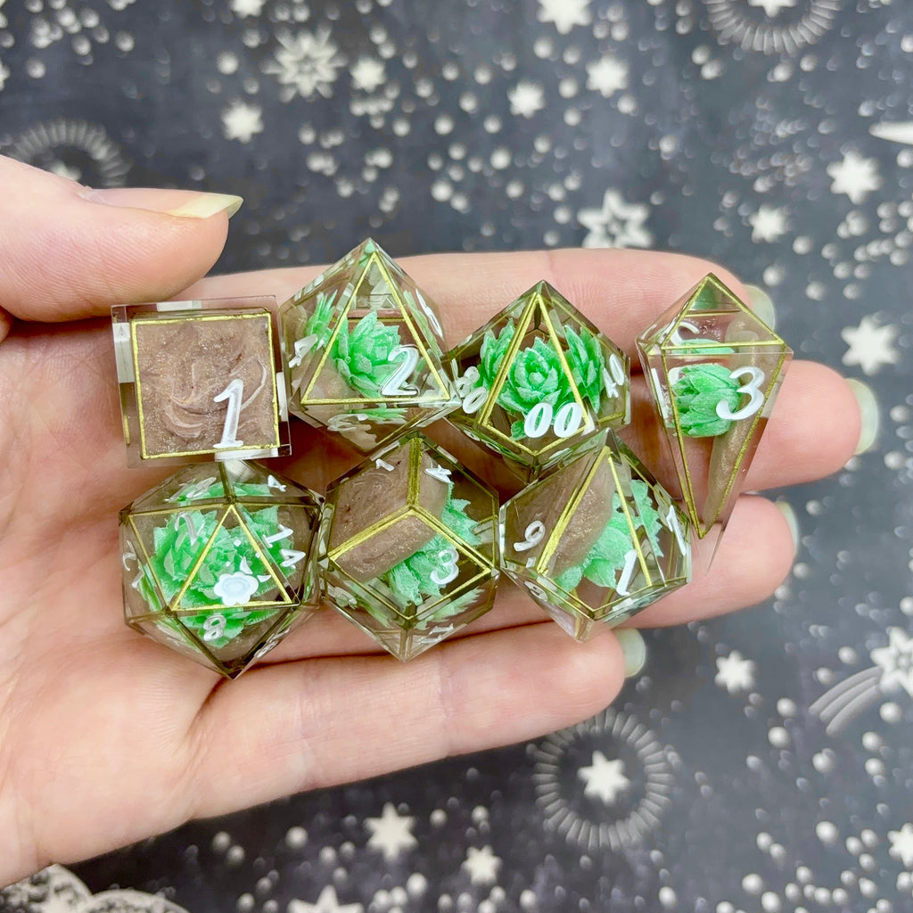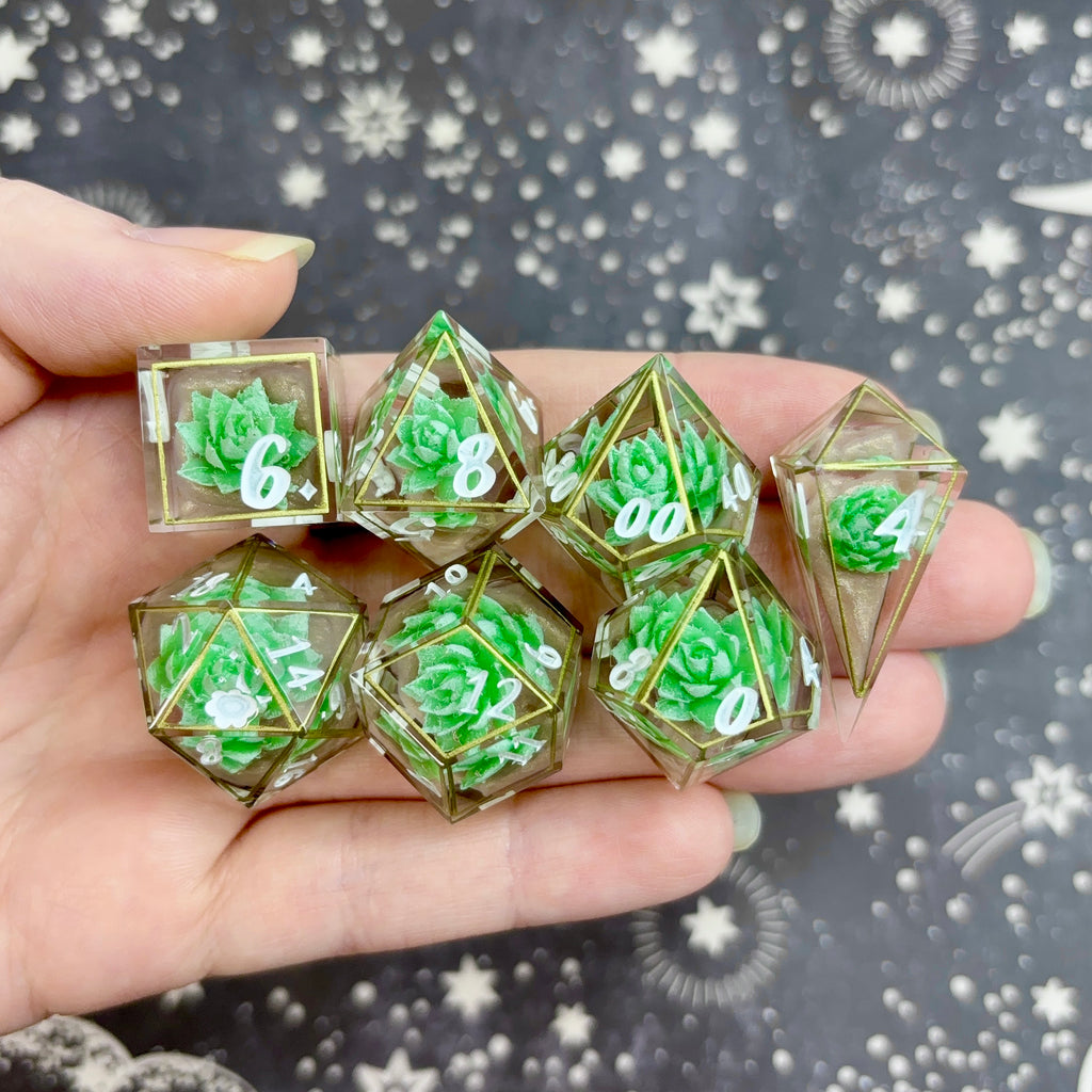 A show-off set (larger dice with the numbers positioned to the bottom right) featuring a clear base with each die holding a green, 3d, resin succulent resting atop a shimmering sandy base, all framed in gold. Numbers inked in translucent white.