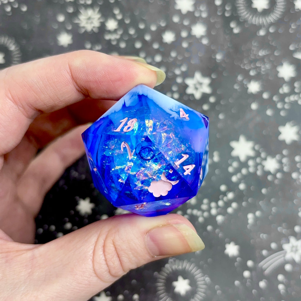 A 35mm liquid core d20 that features a translucent blue and purple base holding a liquid core with reflective, iridescent mylar surrounded by opaque white clouds.  Numbers inked in light pink.