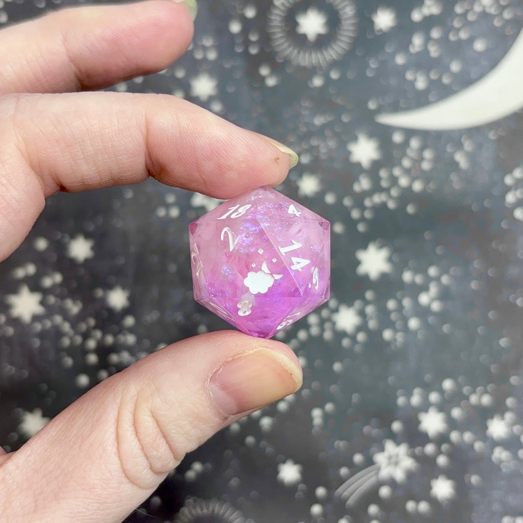 A translucent pink and purple base holds an ethereal shimmer of blue glitter and opaque white clouds. Numbers inked in white.