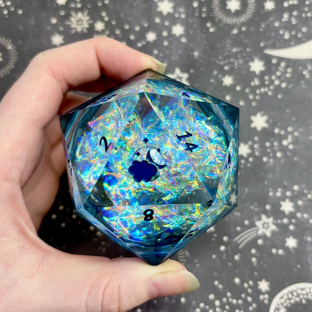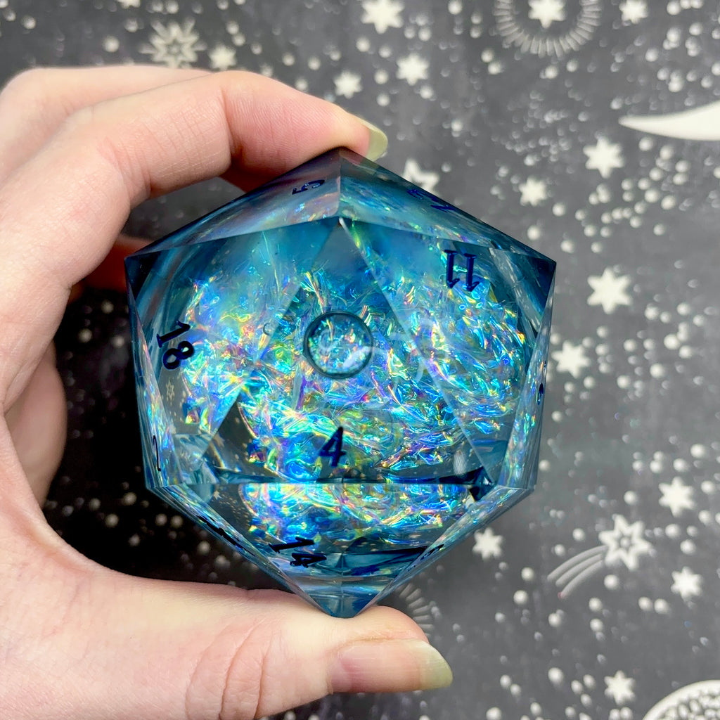 A 60mm liquid core d20 featuring a translucent blue base holding a swirling mix of rainbow iridescent mylar. Numbers inked in navy.