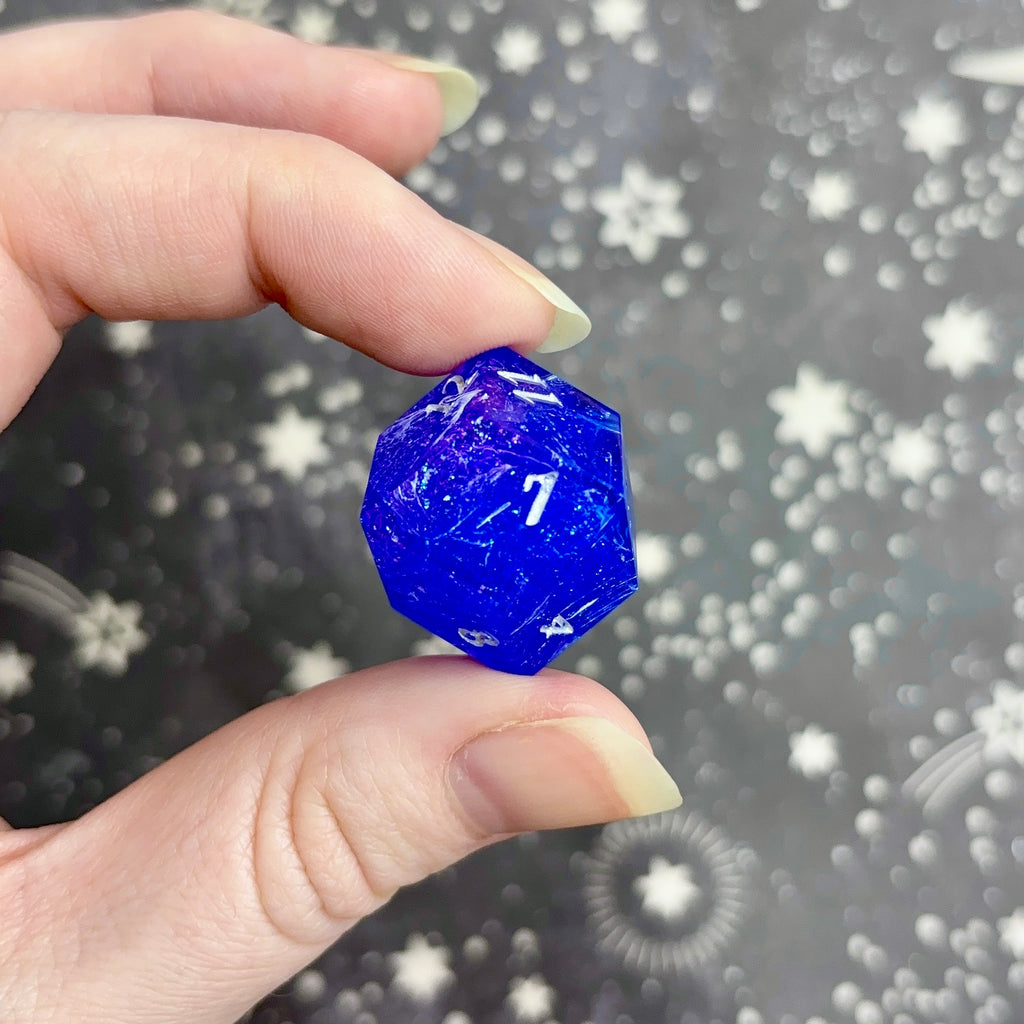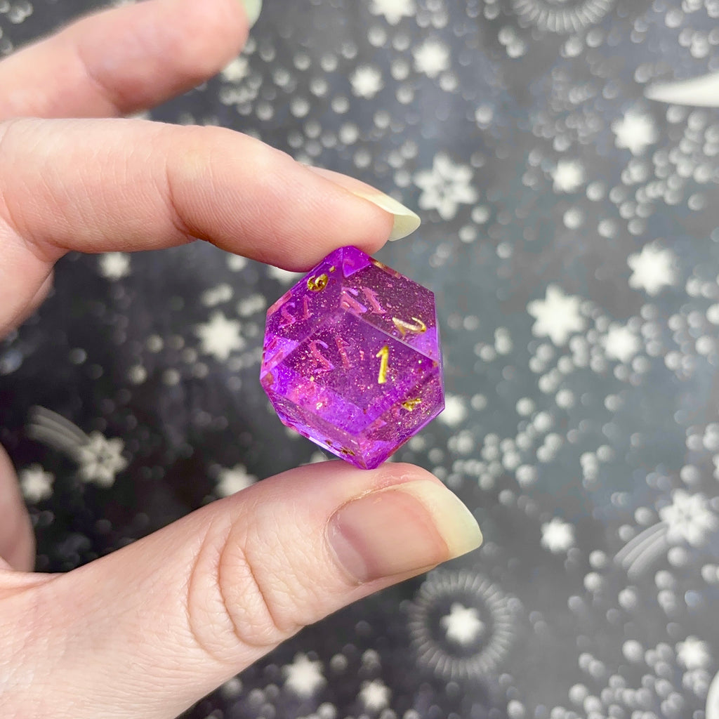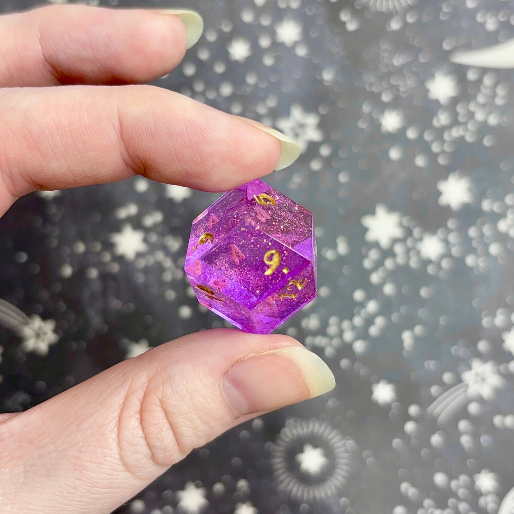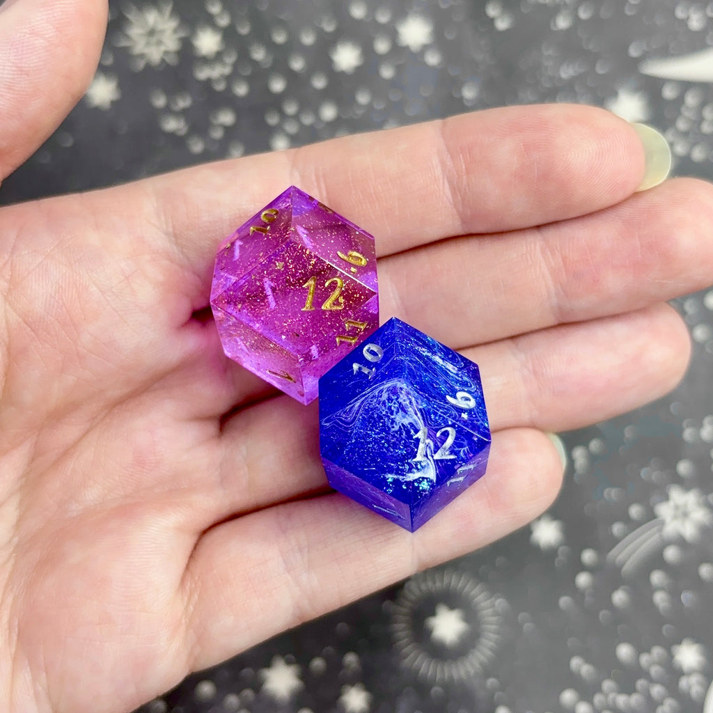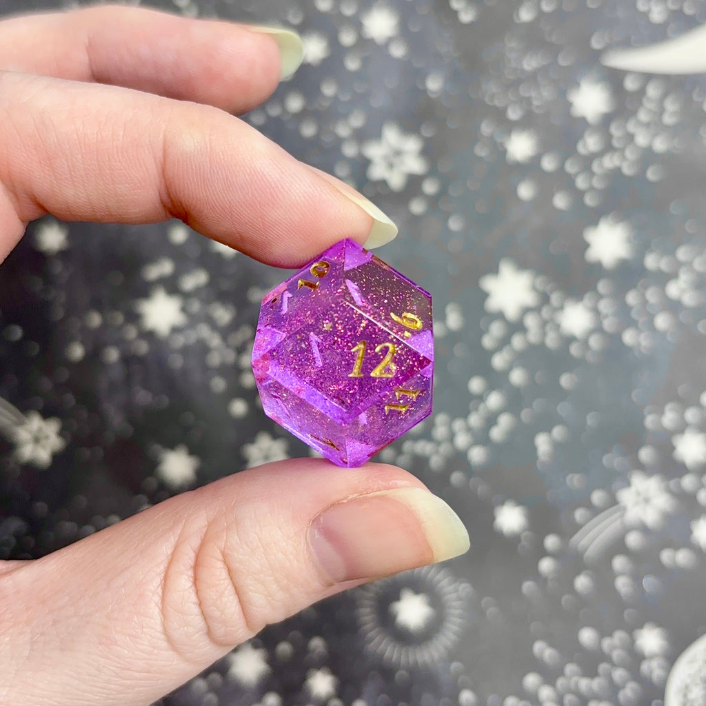 Two show-off d12s (larger dice with smaller numbers on the bottom right), the first featuring a translucent pink base filled with pink and gold glitter and flakes, numbers inked in gold. The second features a glittering, opaque purple base with white striations throughout, numbers inked in silver.