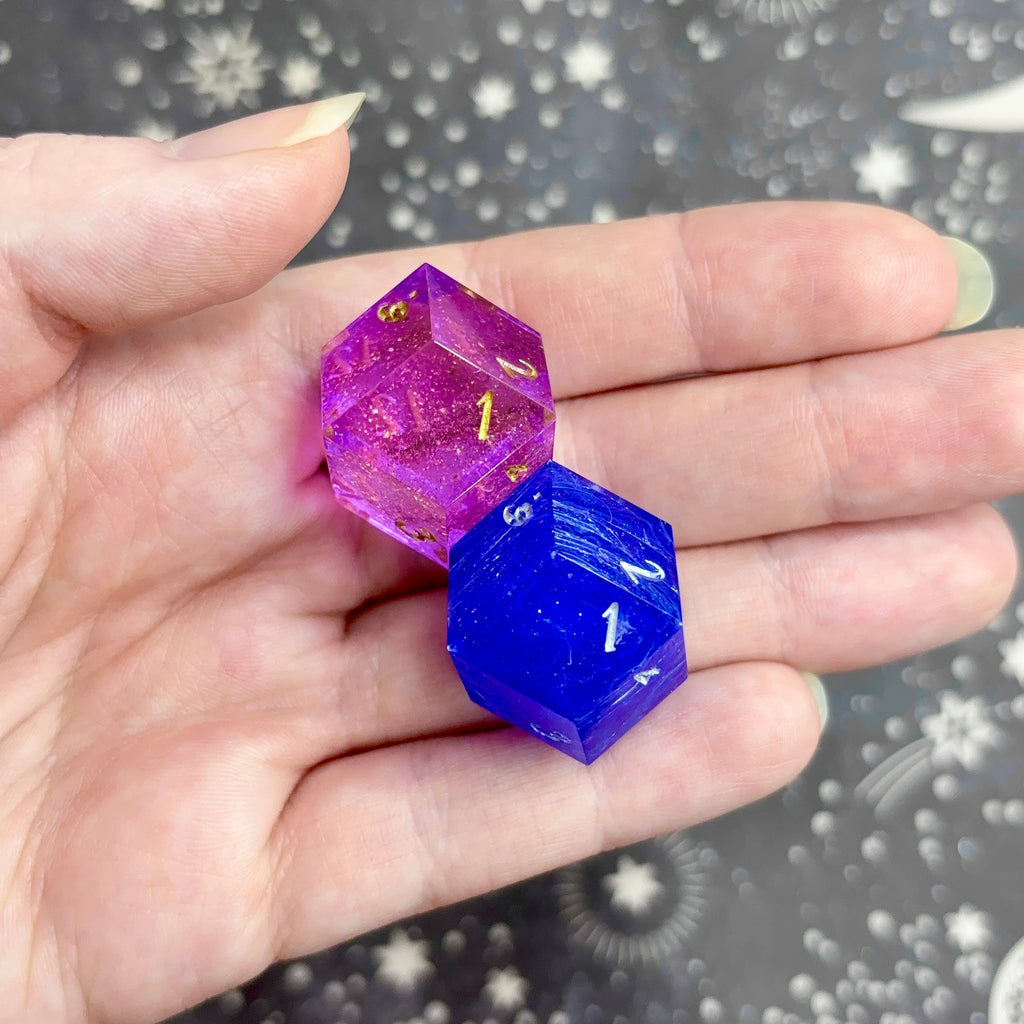 Disclaimer: This product is handmade and is susceptible to minor marks, sanding inconsistencies, gaps in inking, etc. I do my best to clearly specify and identify any quirks, but because everything I sell is personally crafted, occasionally I might miss something.  No quirks will have a negative effect on the playability of the dice.