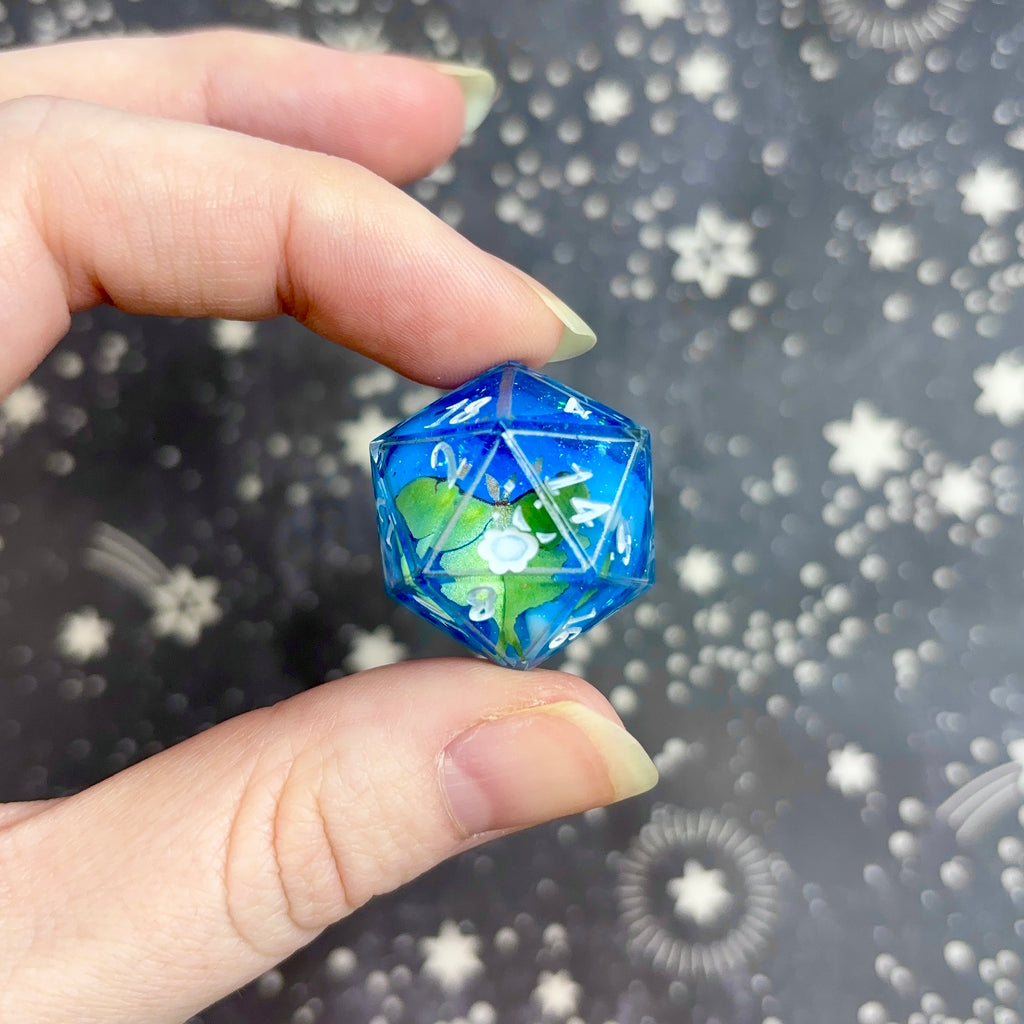 A show-off set (larger dice with the numbers positioned to the bottom right) featuring a clear base with each die holding a paper luna moth surrounded by glittering blue wisps, framed in silver and decorated with white star and moon phase decals. Numbers inked in translucent white.
