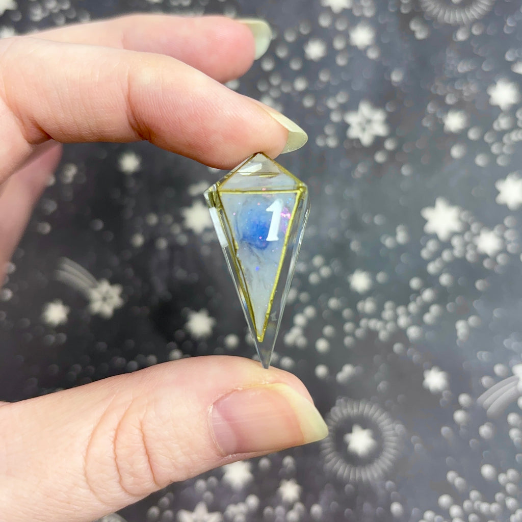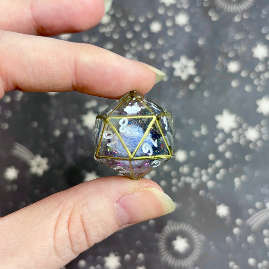 A show-off set (larger dice with the numbers positioned to the bottom right) featuring a clear base with each die holding a swirling blue, purple and white "planet" surrounded by glittering black wisps and opaque white clouds, all framed in gold. Numbers inked in translucent white.