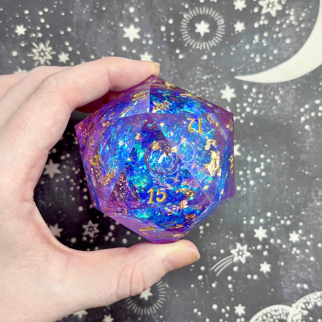 A 60mm liquid core d20 featuring a translucent purple base holding a core filled with iridescent glitter and vibrant blue mylar, surrounded by gold metallic flakes. Numbers inked in gold.