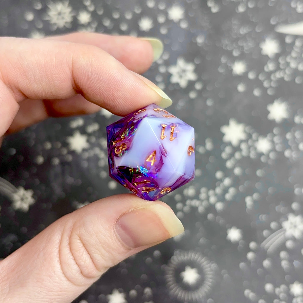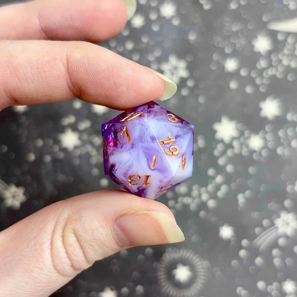 A show-off d20 (larger dice with the numbers positioned to the bottom right) featuring a translucent light purple base holding vibrant, reflective pink mylar and opaque white clouds. Numbers inked in rose gold.