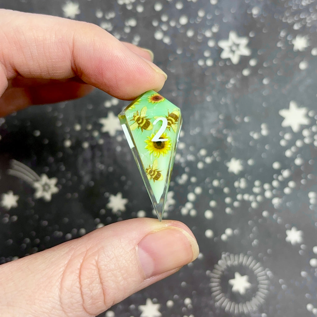 A show-off set (larger dice with the numbers positioned to the bottom right) featuring an opaque green and white base decorated with sunflower and bee decals. Numbers inked in white.