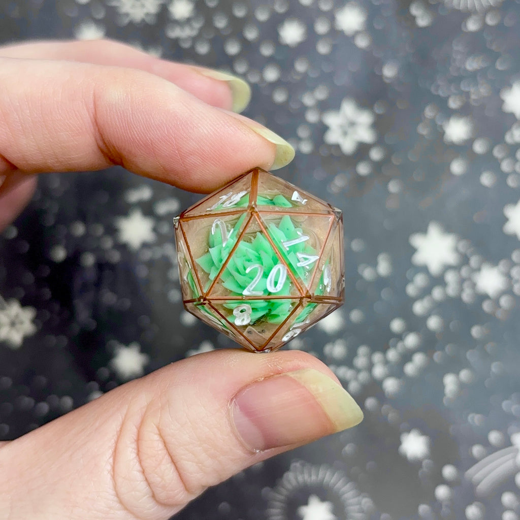A show-off set (larger dice with the numbers positioned to the bottom right) featuring a clear base with each die holding a green, 3d, resin succulent resting atop a shimmering sandy base, all framed in a terracotta color. Numbers inked in translucent white.