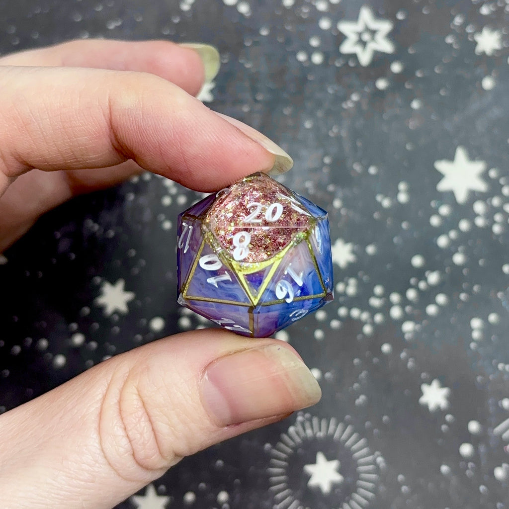 A show-off d20 (larger dice with the numbers positioned to the bottom right) featuring an opaque, shimmering blue base framed in gold that opens to a cavity filled with rose gold glitter and holographic flakes. Numbers inked in translucent white.