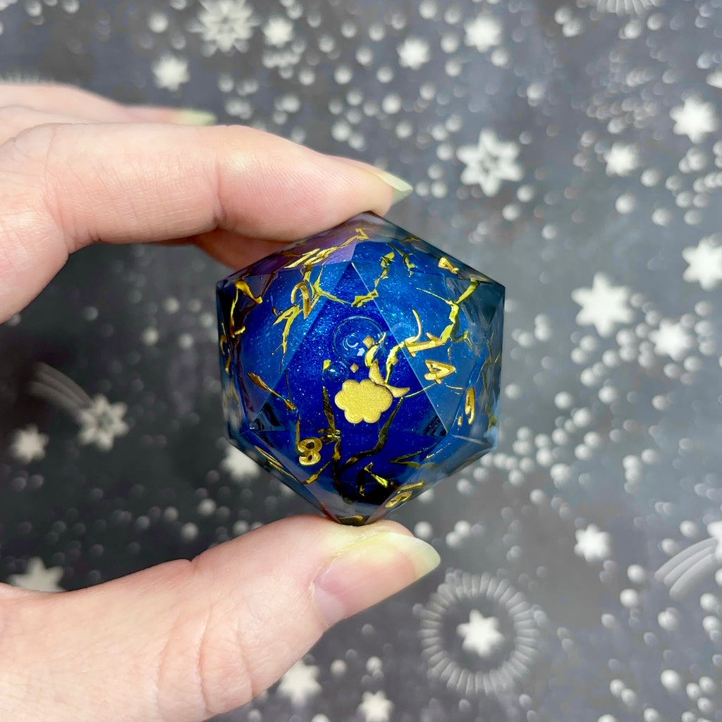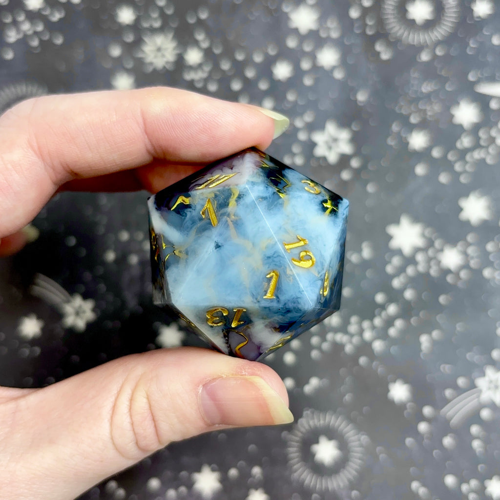 A 35mm liquid core d20 that features a shimmering blue core decorated with lightning-like gold cracks and surrounded by a dark grey hue and opaque white/grey clouds. Numbers inked in gold.